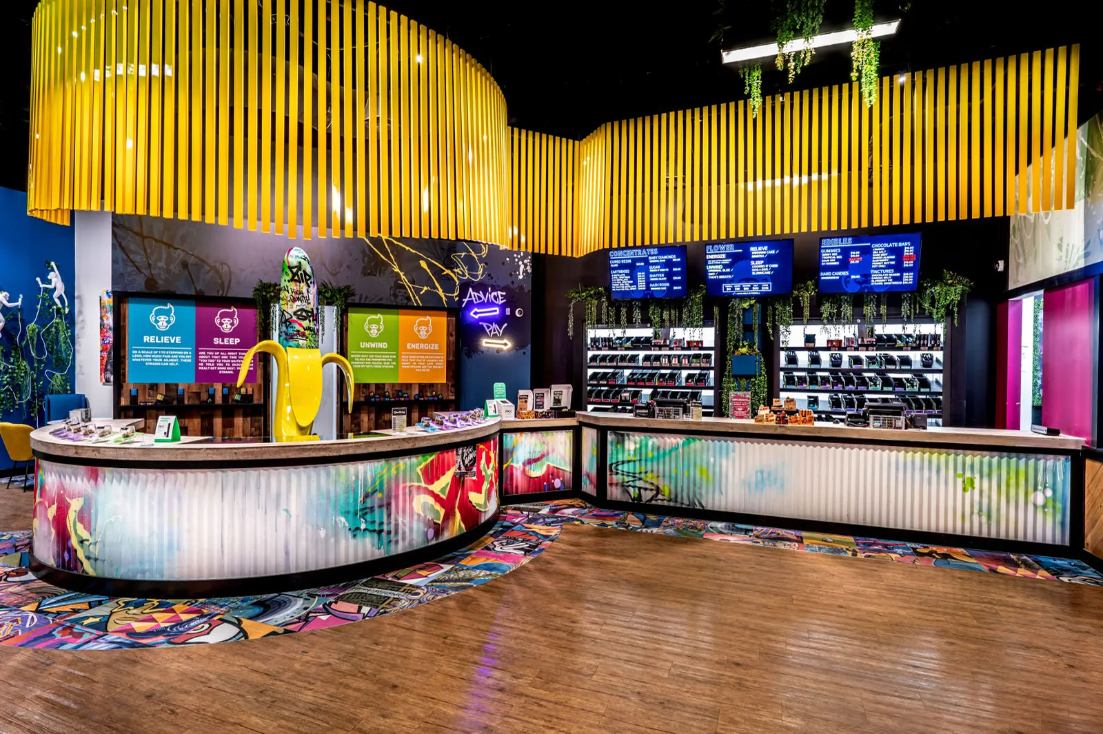 Johnnie Rush, the McBride Company’s head of innovation, suggests, “We treated the space as an immersive art gallery with pop culture-inspired sculptures—including our centerpiece, which is a custom six-foot-tall graffiti-laden banana, and hundreds of hanging wood slats with a gradient from green to yellow like a ripening banana—and numerous original paintings.”