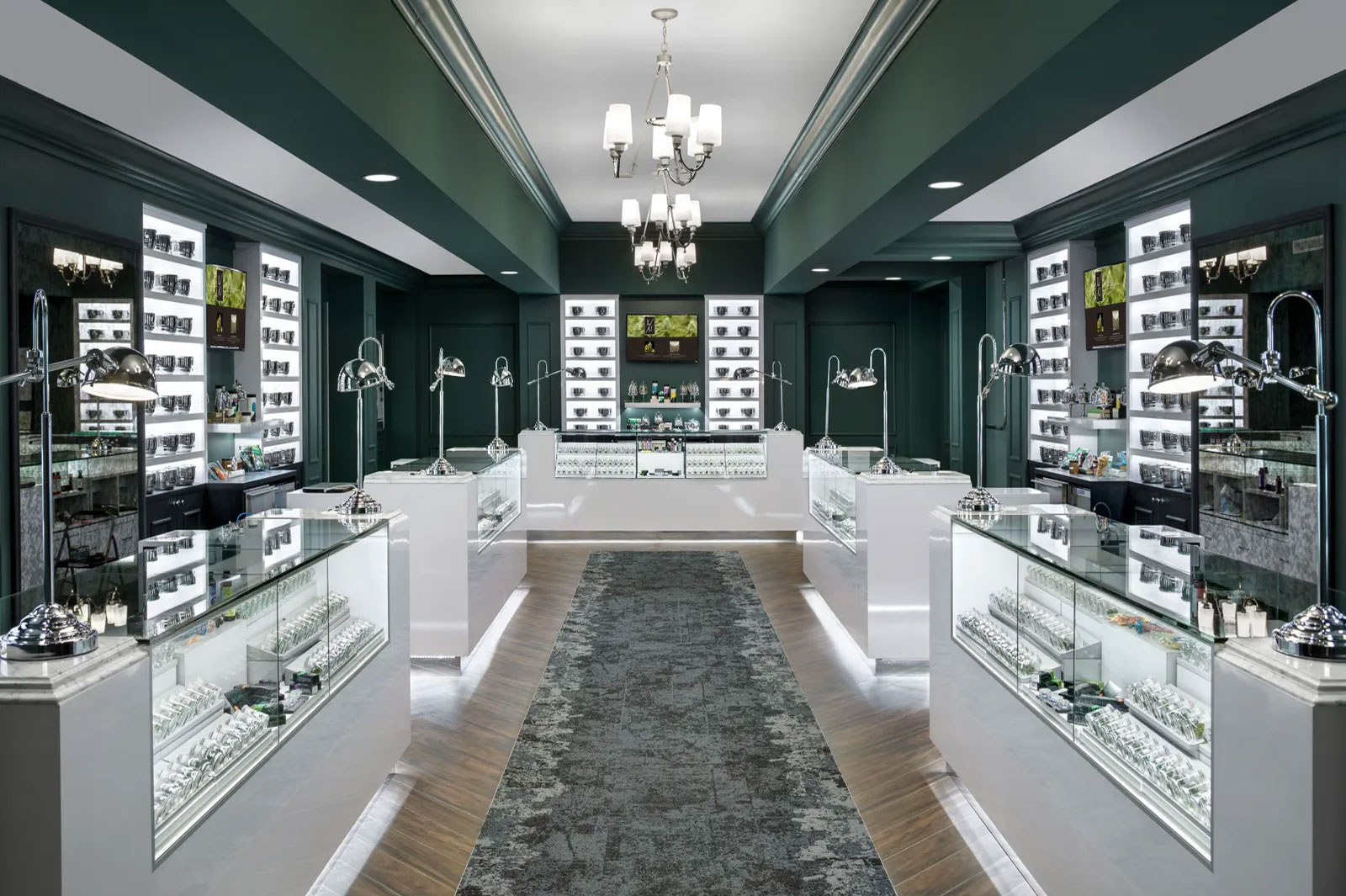 Owned and run by women, Carmel-by-the-Sea’s Synchronicity Holistic is not what you’d expect from a California dispensary. Guests are greeted by a dramatic Carrara marble black-and-white checked floor and super-glossy white lacquered reception desk, both of which set the scene for the feminine yet bold design, which design firm High Road Design Studio based on old-school department store makeup counters.