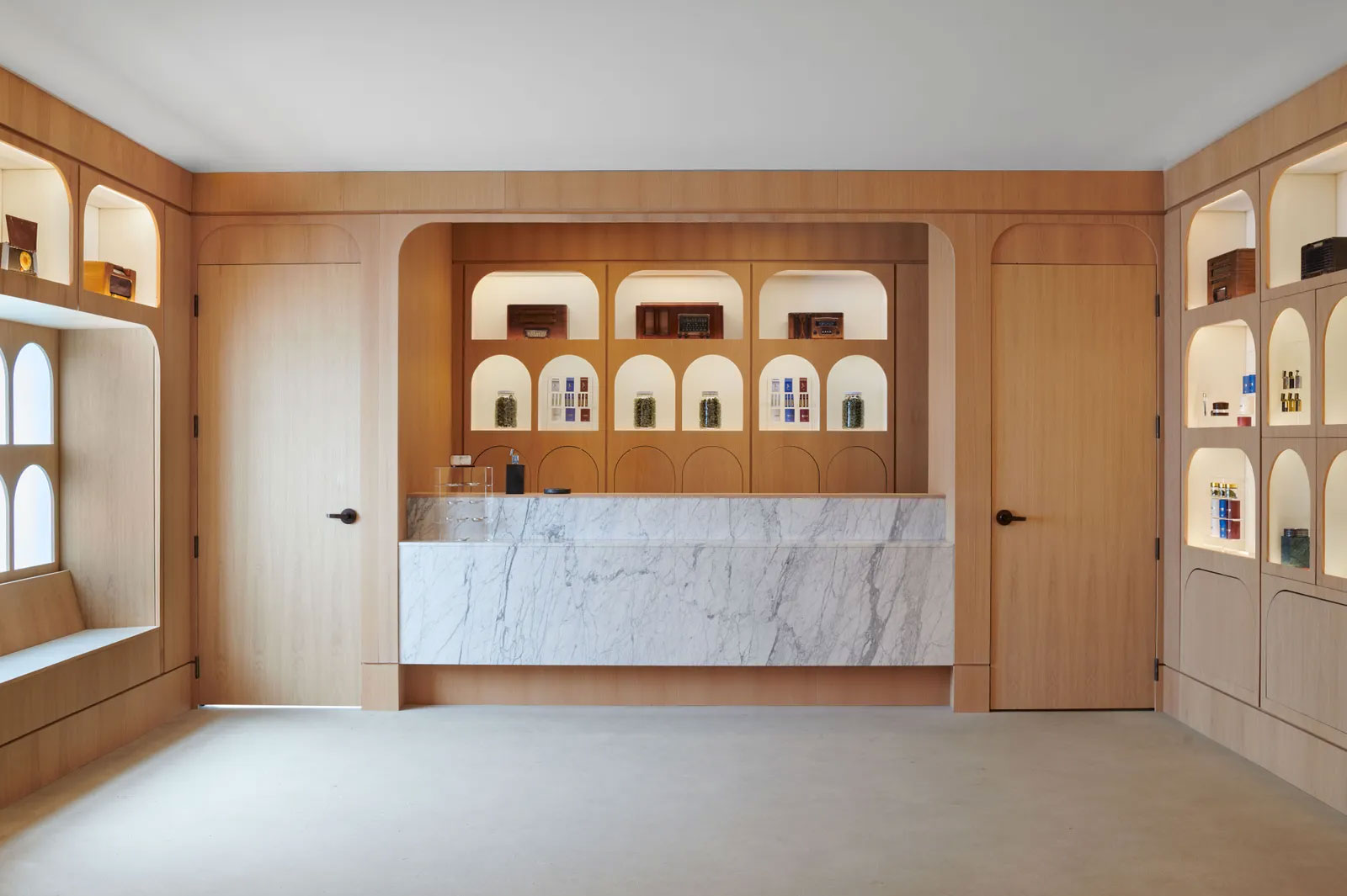 The trio behind the dispensary kept all of the lines—from the counters to the lighting—curved to keep the space feeling soft and fluid. Co-founder and designer Megan Stone says, “A blonde hardwood floor in a custom angled herringbone pattern with mitered edges offers a warm and approachable material application in a sophisticated installation.”
