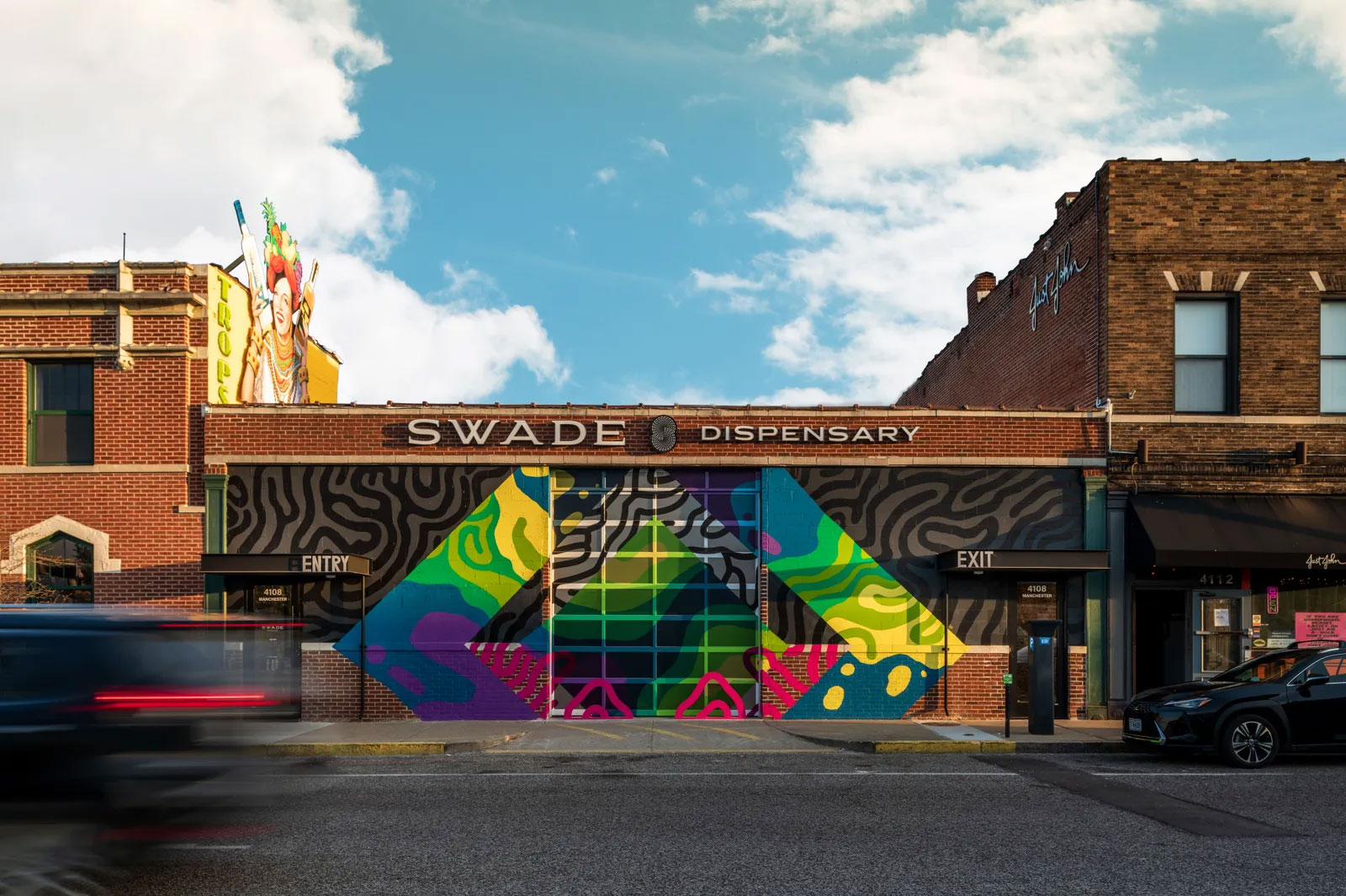 SWADE Cannabis Dispensary’s third brick-and-mortar, a 7,500-square-foot former warehouse, captures the vibrancy and soul of St. Louis. M I N+ Architecture may have embraced the industrial feel of the space with exposed brick and steel beams, but they massively upped the cool factor when they tapped local street artist Jayvn Solomon to design an enormous custom mural on the building’s exterior.